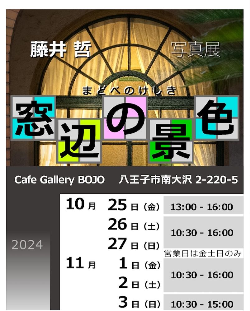 あきる野市在住の藤井哲氏による、窓辺を中心とした写真の展示会。。